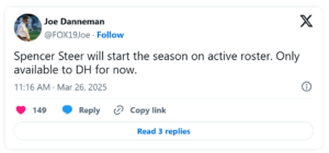Just days ago, it was reported that Steer would start the 2025 season on the IL due to a lingering shoulder injury from 2024, which limited him to just three Cactus League games. While he has been rehabbing, his role will be restricted to designated hitter, and he may only play two out of every three games as he continues his recovery.