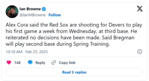 Red Sox manager Alex Cora told MLB.com’s Ian Browne that Devers will continue getting reps at third base throughout camp, preparing for a potential full-time role at the position this season. Meanwhile, Alex Bregman will play second base during spring training, though no final decision has been made on their defensive assignments for the regular season.