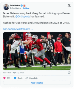 A potential addition like Burrell could help Kansas State reload at running back following the departure of standout D.J. Giddens to the NFL. The Wildcats still have Dylan Edwards and Joe Jackson, but depth is a concern—especially with injury-prone transfer Gabe Ervin Jr. joining from Nebraska and La’James White recently hitting the portal.