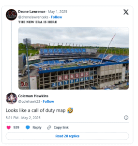 Among the matchups at the newly upgraded venue, KU will host its in-state rival Kansas State as it aims to snap a 16-game losing streak to the Wildcats. However, a photo of one of the stadium’s new wings sparked some playful criticism online. Former K-State basketball player Coleman Hawkins chimed in on the design, joking, “Looks like a Call of Duty map.